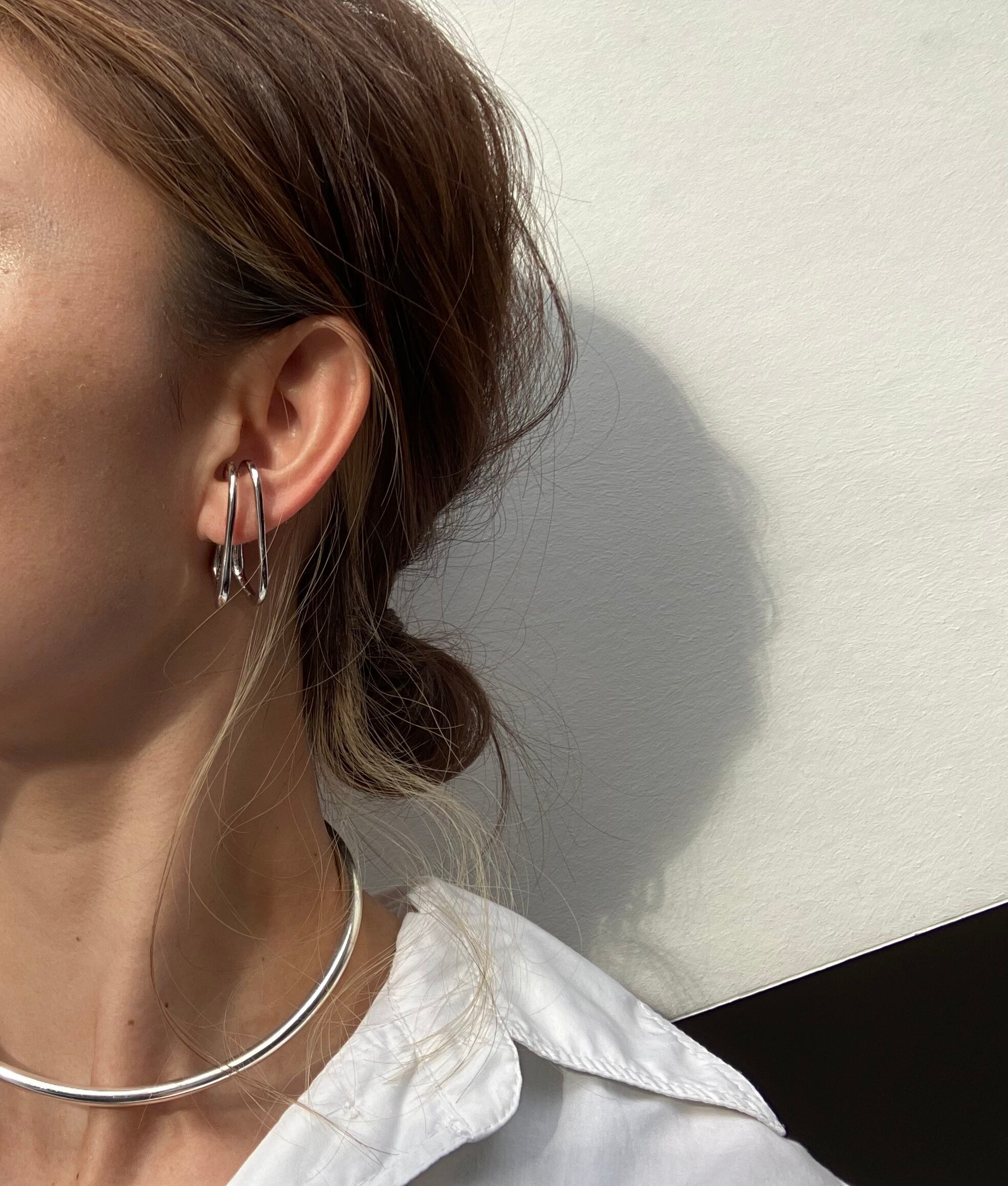 緩やかな曲線が特徴的な少し大きめのイヤーカフ。 お手持ちの小ぶりのスタッドピアスと合わせて頂くのもお勧めです。 素材: 合金