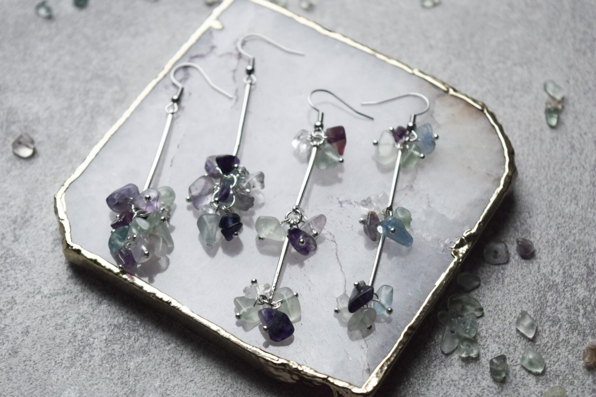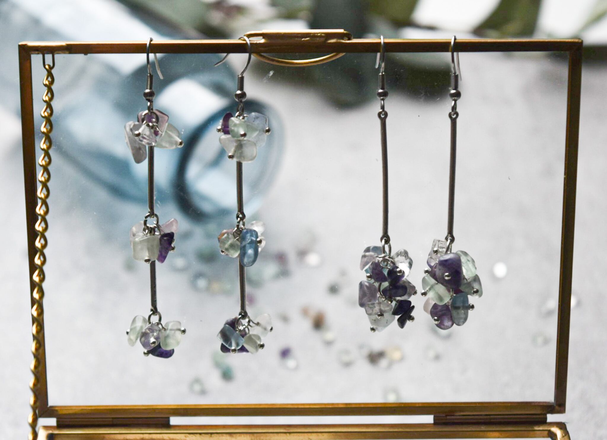 天然石フローライトの優しい色みが特徴的な揺ら揺らピアス。