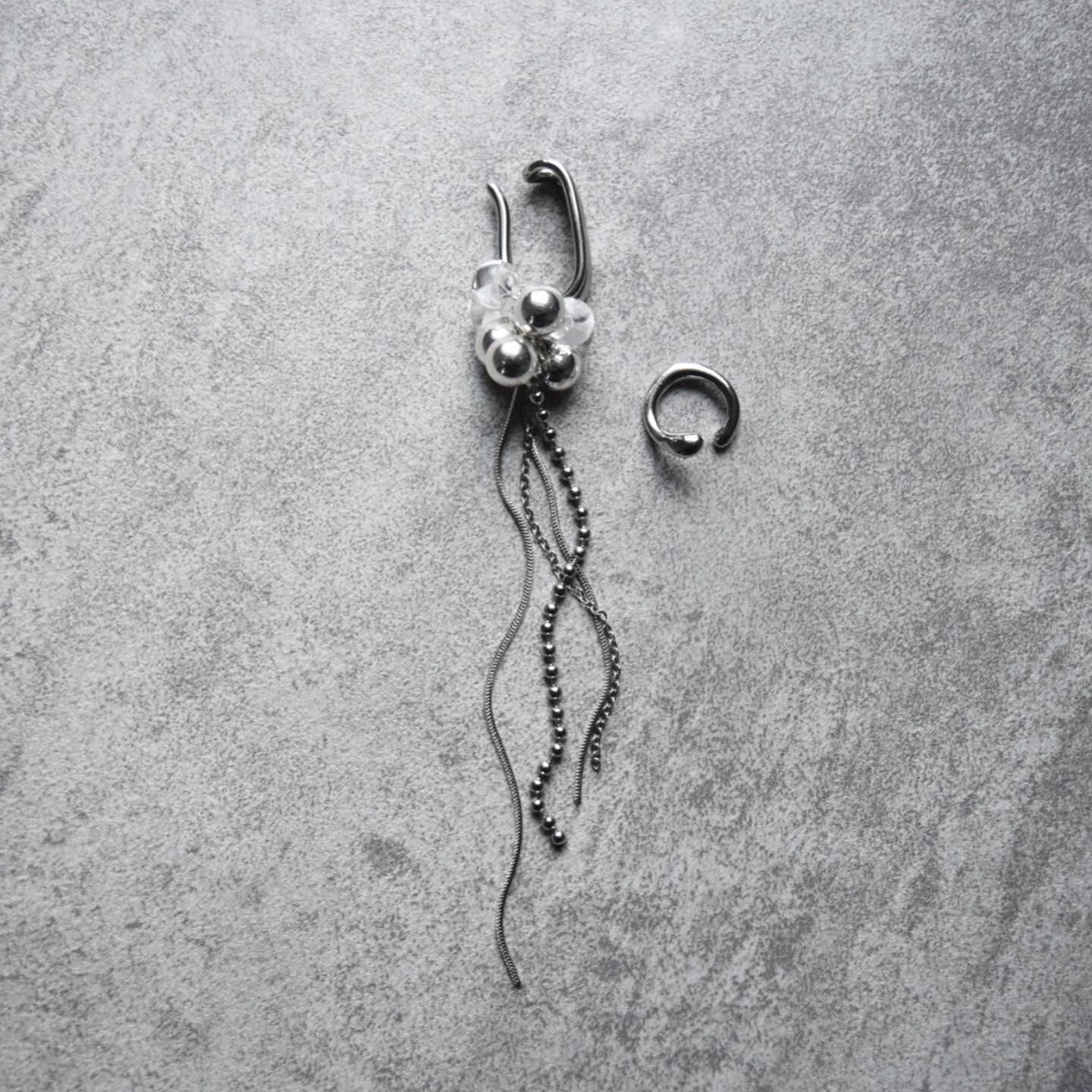 シルバーとクリアで統一した、スタイリッシュでお洋服の色とも合わせやすいデザイン。3種類のチェーンで変化をつけ、大人の女性のしなやかさを表現します。 イヤカフ部分: 合金