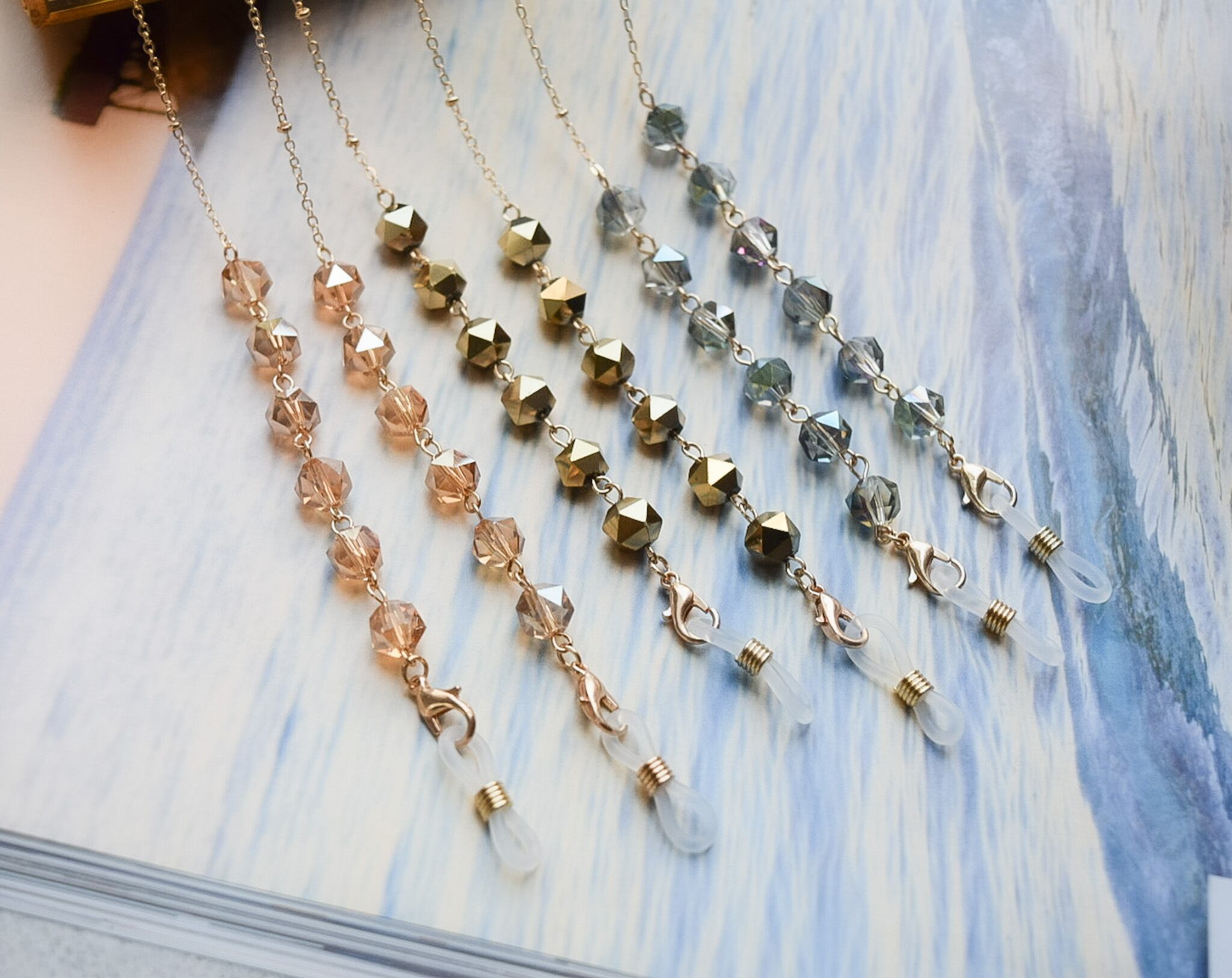 華奢なゴールドチェーンとファセットカットのビーズを合わせた春/夏にお勧めのストラップ